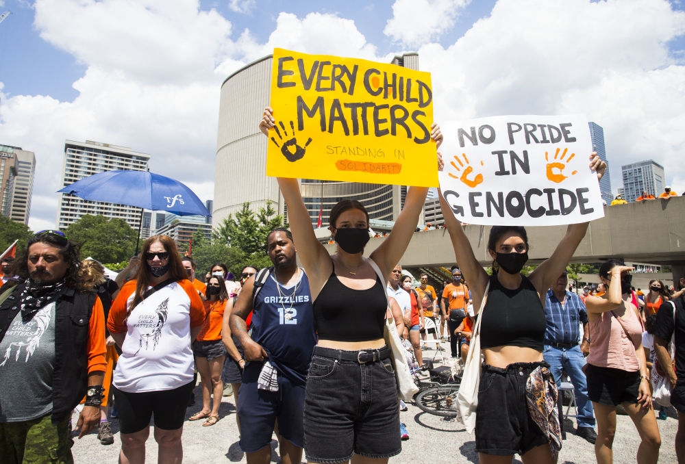 7月1日,人们在加拿大多伦多集会悼念原住民寄宿学校死难者。(新华社发,邹峥摄)