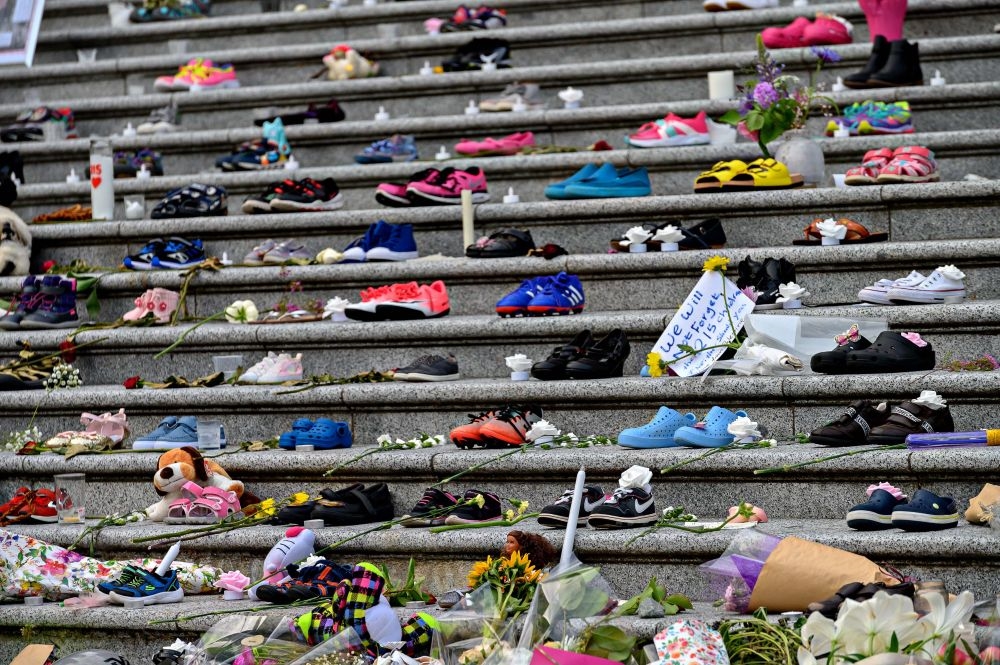 5月30日,在加拿大温哥华,人们摆放鲜花、鞋子等物品,悼念不列颠哥伦比亚省坎卢普斯市一所原住民寄宿学校的死者。(新华社发,宋伟仁摄)