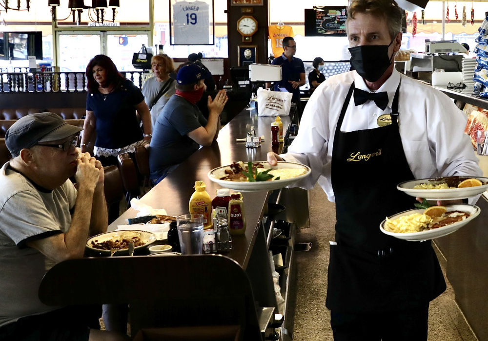 6月15日,民众在美国洛杉矶一家餐厅用餐。(新华社发)
