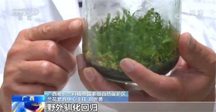 广西雅长兰科植物国家级自然保护区兰花繁育中心主任 刘世勇:世界首次采取人工繁育的方式获得这个种苗,这个种苗目前是增殖苗,再有几个月时间,我们就可以拿到野外驯化回归,减少我们的保护压力。