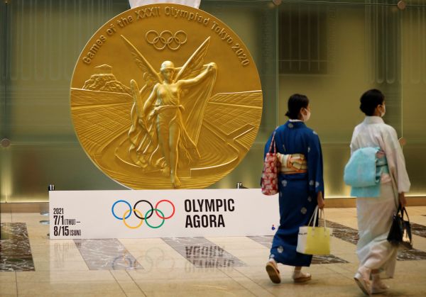 东京奥运会将采取“自助式颁奖”。图为东京市民从东京奥运会金牌模型前走过。(路透社)