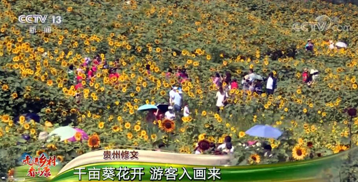 央视网消息:您现在看到的是位于贵州省贵阳市修文县清江村的向阳花田,这里的近千亩向日葵这两天正陆续开放,满山遍野一片金黄。盛开的向日葵迎风摇曳,朵朵金黄将田园演绎得如诗画一般。