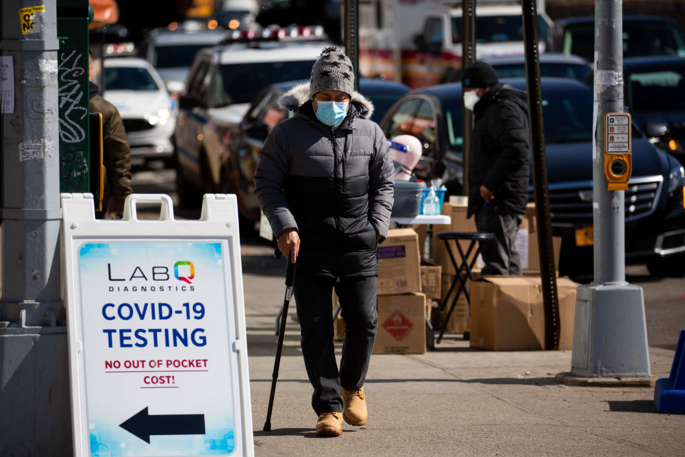 3月8日,美国纽约一名路人在新冠检测指示牌旁行走。(新华社发,郭克摄)