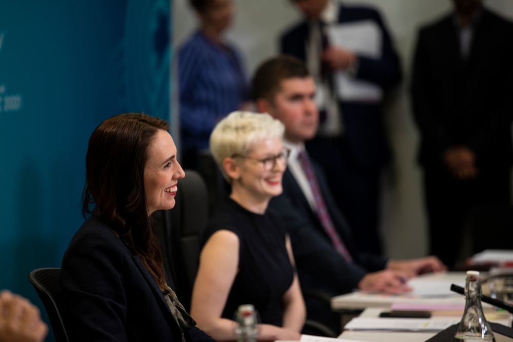 7月16日,新西兰总理阿德恩(左一)在惠灵顿出席亚太经合组织(APEC)领导人非正式会议。(新华社发)
