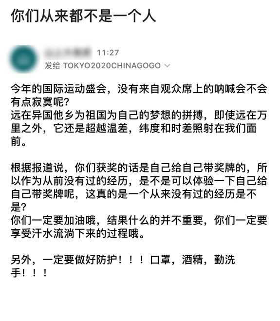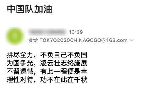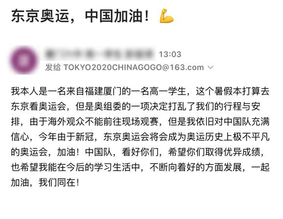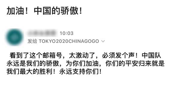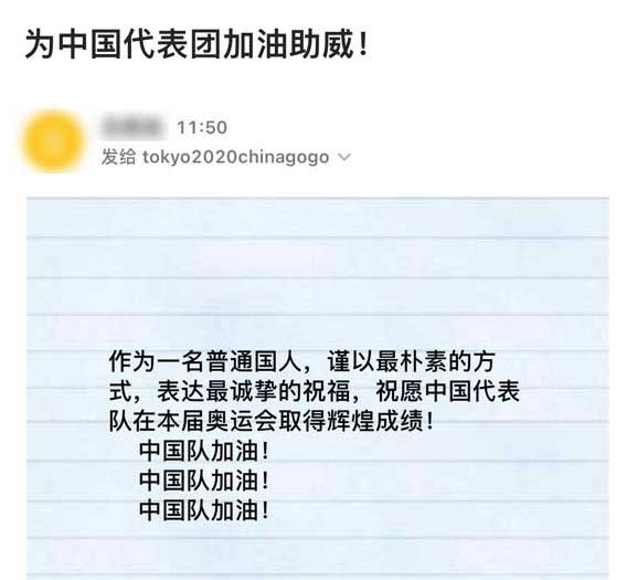 在东京奥运会、残奥会期间,中国驻日本使馆专门开设“中国加油站”电子邮箱(TOKYO2020CHINAGOGO@163.com),接收同胞们为中国队加油助威的邮件,每天将精选数封发布于大使馆网站及微信公众平台。赛事结束后,所有邮件将转交给中国代表团。