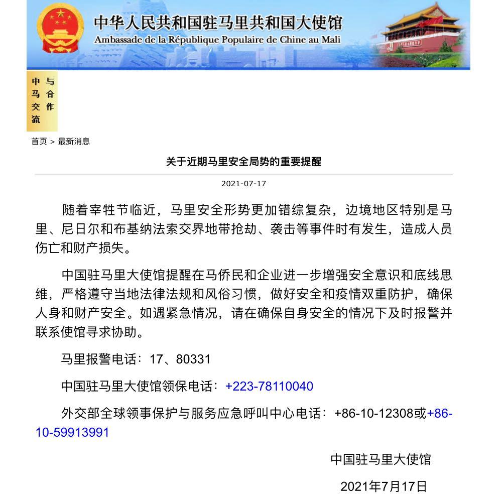 中国驻马里大使馆提醒在马侨民和企业进一步增强安全意识和底线思维,严格遵守当地法律法规和风俗习惯,做好安全和疫情双重防护,确保人身和财产安全。如遇紧急情况,请在确保自身安全的情况下及时报警并联系使馆寻求协助。