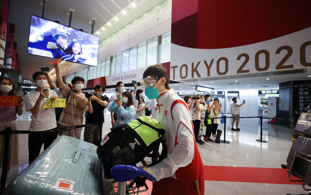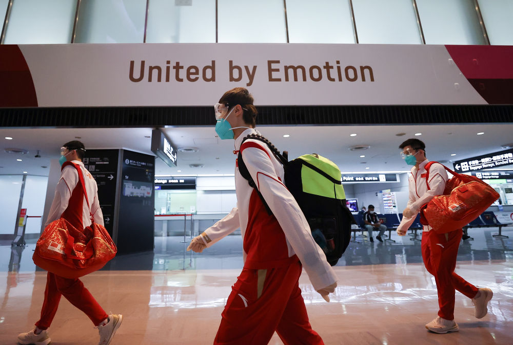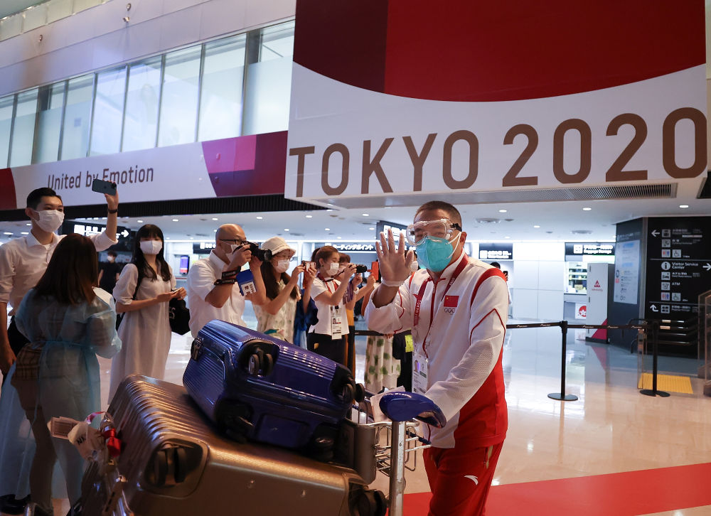 ↑2021年7月17日,中国乒乓球队成员抵达东京成田机场。新华社记者曹灿摄