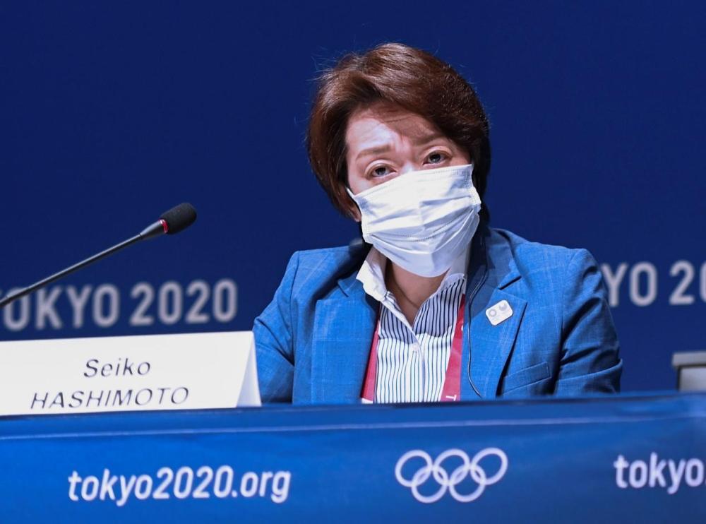 ↑2021年7月17日,东京奥组委主席桥本圣子(中)出席新闻发布会。新华社记者贺长山摄