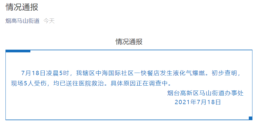 山东烟台高新区马山街道办事处在其微信公众号上通报,7月18日凌晨5时,该辖区中海国际社区一快餐店发生液化气爆燃。初步查明,现场5人受伤,均已送往医院救治。具体原因正在调查中。