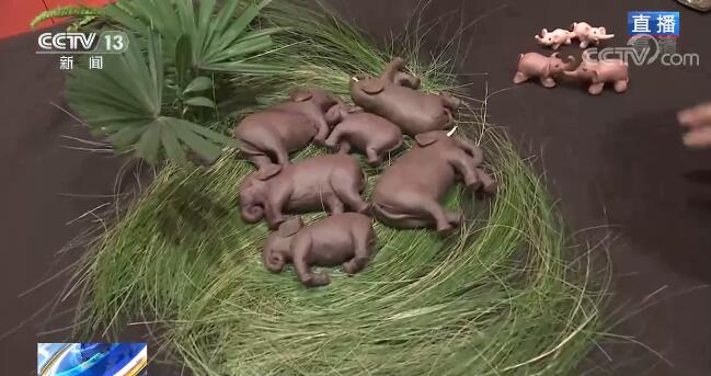 蒋树林介绍,大象遇见非遗会碰撞出什么样的火花可以通过两幅图和一个场景给大家揭秘。第一幅图大家很熟悉,但是它是用刺绣完成的;第二幅图是绣娘一针一线绘就的象群行进“路线图”,用小小拇指鞋指代大象的大脚印;最后一个场景是手工艺人用面塑制作的象群,看上去萌萌哒。