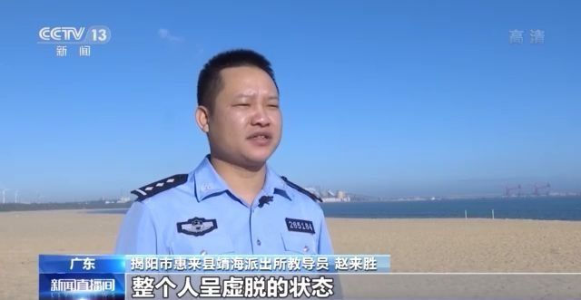 广东揭阳市惠来县靖海派出所教导员 赵来胜:当时我们发现他的时候,他已经被海水冲到沙滩边了,整个人呈虚脱的状态。