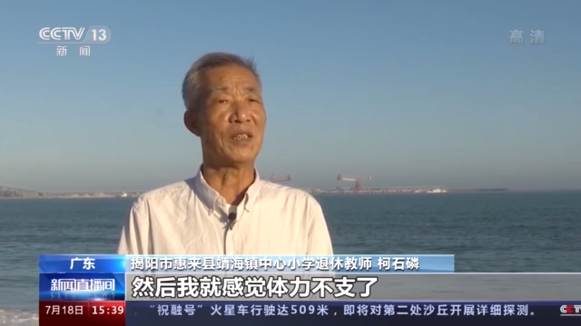 广东揭阳市惠来县靖海镇中心小学退休教师 柯石磷:在(海)里面有十多分钟,我就感觉体力不支了,一个浪把我一拉就几百米远。