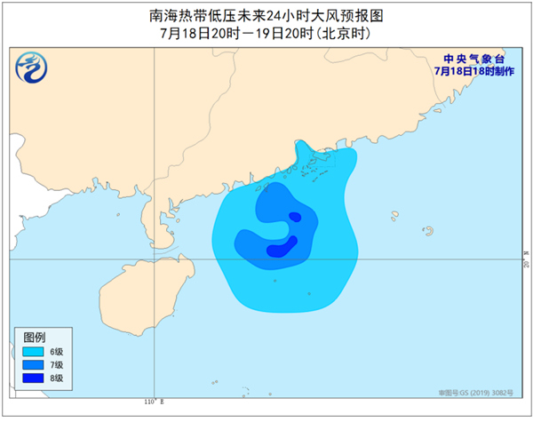 中央气象台7月18日18时发布台风蓝色预警:位于南海北部的热带扰动已于今天(18日)下午发展为热带低压,17时其中心位于广东阳江东偏南方约245公里,就是北纬20.9度、东经114.1度,中心附近最大风力7级(15米/秒),中心最低气压1000百帕。