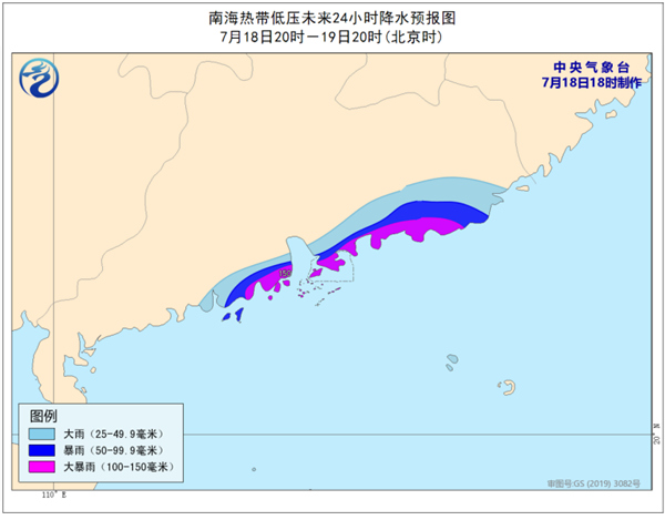 降水预报:18日20时至19日20时,广东南部沿海地区将有大雨或暴雨,局地有大暴雨(100-150毫米)。