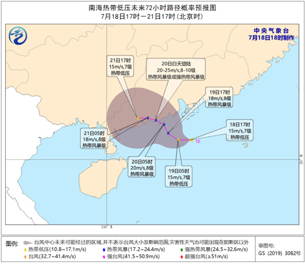 预计,该低压中心将回旋少动,强度逐渐加强,有可能发展为今年第7号台风,20日白天在广东中西部沿海登陆(热带风暴级或强热带风暴级,8~10级,20~25米/秒);也有可能在广东中西部近海海面徘徊少动,而后向东北方向移动。
