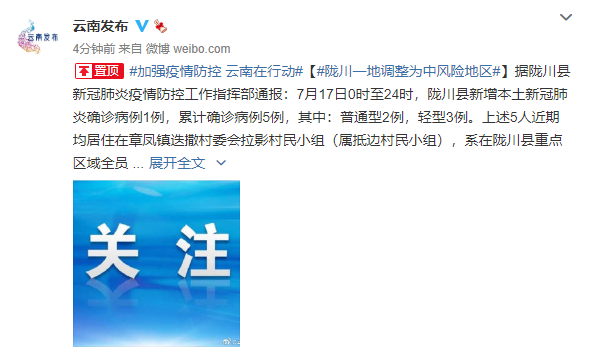 根据国家和省关于应对新冠肺炎疫情分区分级防控工作要求,经疫情防控专家组评估,自2021年7月18日20时起,将陇川县章凤镇迭撒村拉影村民小组调整为中风险地区,其他区域仍为低风险地区。