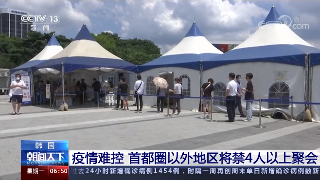 韩国国务总理金富谦18日宣布,19日起,一直到8月1日,首都圈以外全国所有地区禁止四人以上私人聚会,以遏制疫情恶化。