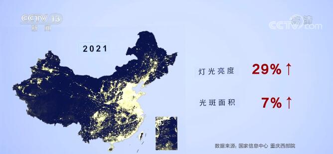这是去年上半年的夜晚灯光图,当我们把今年上半年的夜晚灯光图叠加在上面时,可以看到整张图亮了起来,光斑面积也变大了。两个指标的增长中,蕴含着中国经济发展的新生力量。