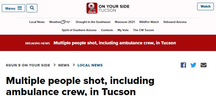 据图森市警察局局长克里斯·马格努斯称,18日大约15:45左右,亚利桑那州图森市一名35岁男子向一辆救护车的司机及车上护理人员开枪,造成该名司机及一名护理人员受伤。随后,枪手开车来到附近着火房屋的现场,向正在进行灭火作业的消防人员以及当地居民开枪。一名当地居民被子弹击中头部死亡,一名消防人员和一名当地居民受伤。