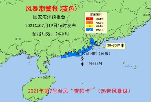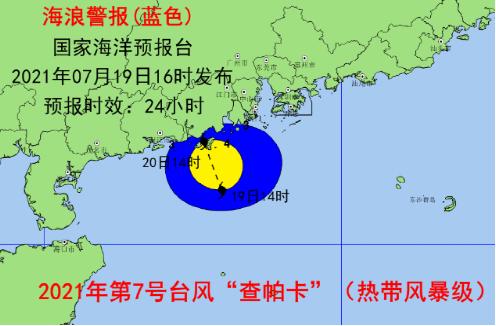 今天(19日)早上8时,2021年第07号台风“查帕卡”(热带风暴级,英文名:CEMPAKA)已生成, 15时其中心位置处于距离广东省阳江市东南方向约140公里的海面上,将向偏北方向移动,强度逐渐加强。受其影响,国家海洋预报台今天下午继续发布风暴潮蓝色警报和海浪蓝色警报。