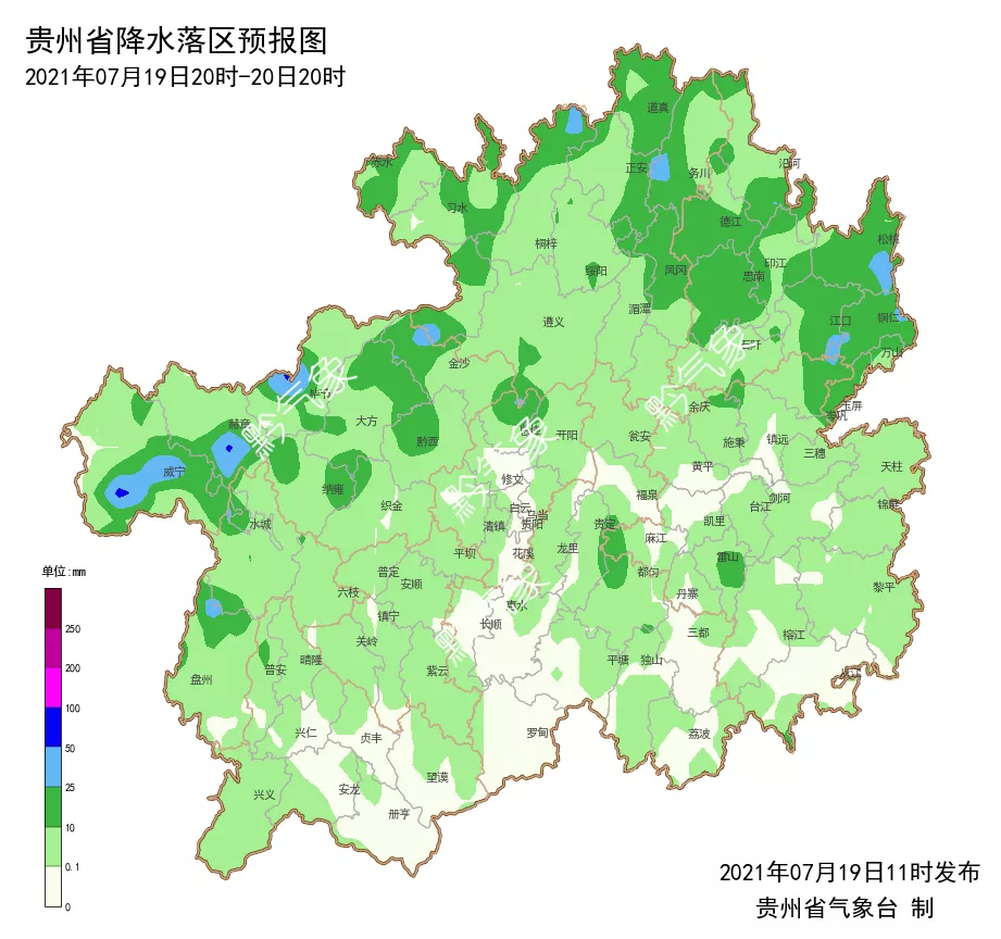 据贵州省气象台最新气象预报,7月19日夜间到20日白天,贵州省的西部、北部地区阴天间多云有阵雨或雷雨,局地中到大雨,个别乡镇暴雨,其余地区多云间阴天有分散阵雨或雷雨。