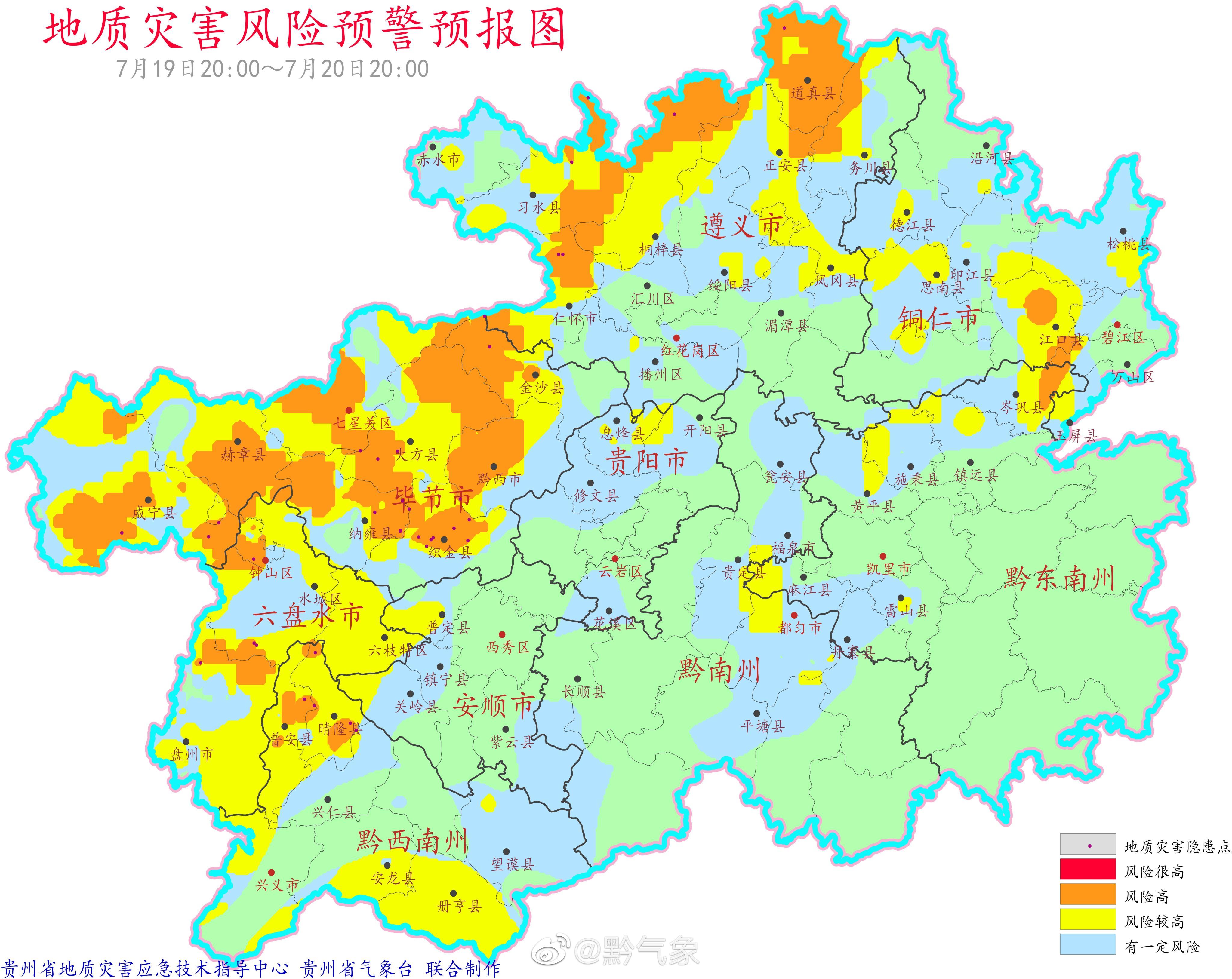 7月19日下午,贵州省气象台继续发布地质灾害气象风险预警,预计7月19日20时至7月20日20时:毕节市中部、六盘水市南部、黔西南州北部和南部、遵义市北部、铜仁市南部和黔东南州南部地质灾害气象风险较高,其中毕节市局地和六盘水市局地地质灾害气象风险高,请注意防范!