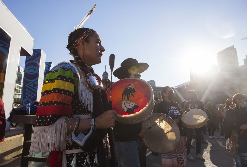 5月30日,原住民在加拿大多伦多参加集会活动,悼念不列颠哥伦比亚省“坎卢普斯印第安寄宿学校”的死者。(新华社发,邹峥摄)