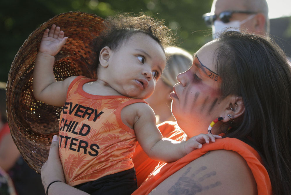 6月2日,民众在加拿大温哥华参加集会活动,悼念不列颠哥伦比亚省“坎卢普斯印第安寄宿学校”的死者。(新华社发,梁森摄)