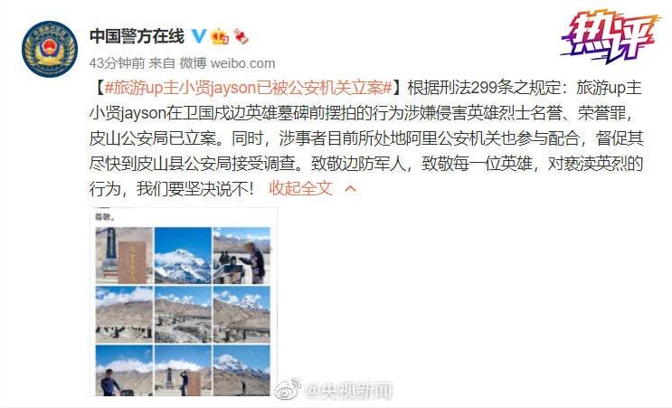 据中国警方在线官方微博消息,旅游博主“小贤jayson”在卫国戍边英雄墓碑前的摆拍行为,涉嫌侵害英雄烈士名誉、荣誉罪,皮山公安局已立案。涉事者目前所处地阿里公安机关也参与配合,督促其尽快到皮山县公安局接受调查。
