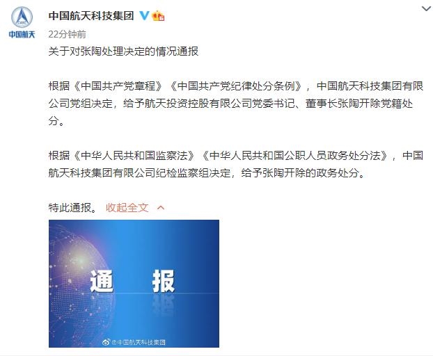 中国航天科技集团发布关于对张陶处理决定的情况通报:根据《中国共产党章程》《中国共产党纪律处分条例》,中国航天科技集团有限公司党组决定,给予航天投资控股有限公司党委书记、董事长张陶开除党籍处分。
