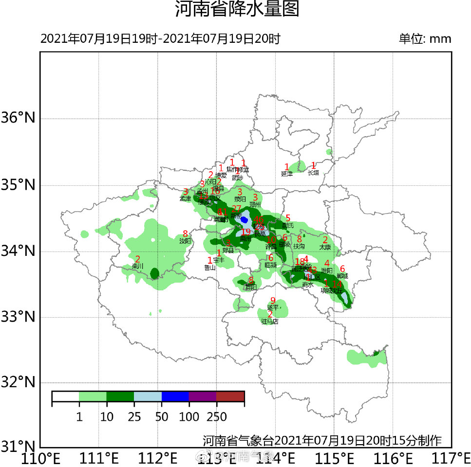 另据了解,19日当晚17时至19日20时:洛阳、郑州、许昌、周口局地出现暴雨,焦作、平顶山、漯河、开封、南阳、信阳局地出现大雨。有46个雨量站降水量超过50毫米,最大降水量出现在郑州市巩义市四初中90.4毫米。最大小时雨强出现在郑州市新密市来集77.0毫米。 (总台记者 田萌)