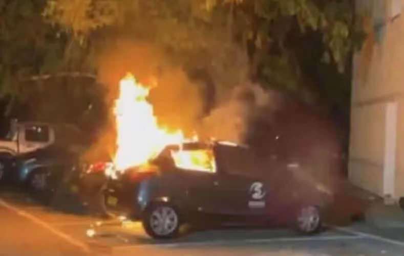 示威者还放火焚烧停车场的汽车,4辆印有西格马电视台字样的汽车遭到不同程度损毁,其中1辆汽车被烧得面目全非。