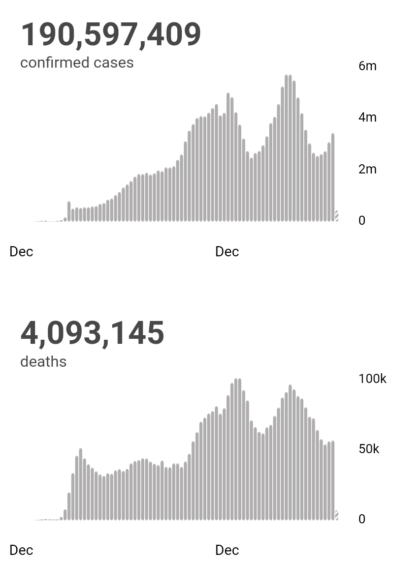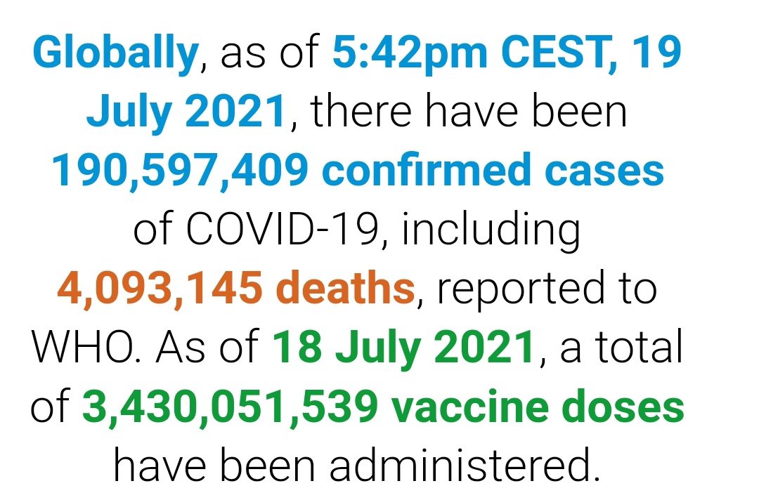 根据世卫组织最新实时统计数据,截至欧洲中部夏令时间7月19日17时42分(北京时间7月19日23点时42分),全球累计新冠肺炎确诊病例190597409例,累计死亡病例 4093145例。19日全球新冠肺炎确诊病例新增427576例,死亡病例新增7145例。
