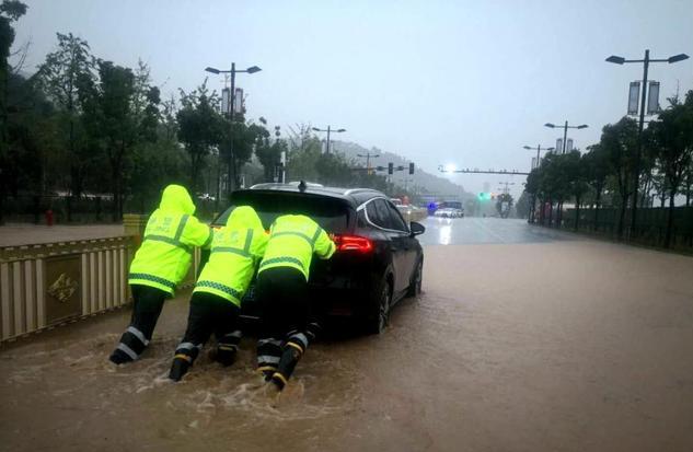 △湖北襄阳遭遇强降雨 民警推行受困车辆