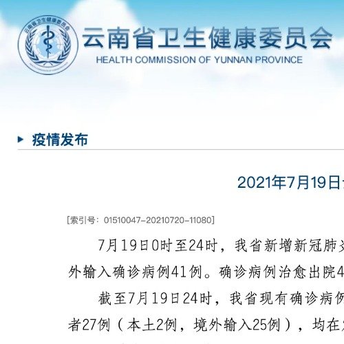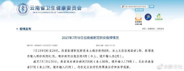 【#云南19日新增本土确诊病例8例#】云南省卫生健康委员会7月20日通报,19日0时至24时,云南省新增新冠肺炎本土确诊病例8例,其中7人在瑞丽市重点人群核酸检测中发现,1人在陇川县重点人群核酸检测中发现;新增本土无症状感染者1例。新增境外输入确诊病例41例。确诊病例治愈出院4例(本土、境外输入各2例)。截至7月19日24时,云南省现有确诊病例259例(本土80例,境外输入179例)、无症状感染者27例(本土2例,境外输入25例),均在定点医疗机构隔离治疗和医学观察。(记者姚兵)