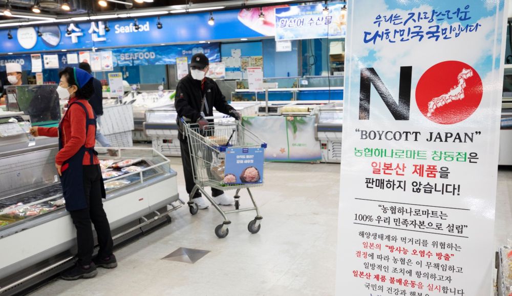 4月14日,韩国首尔的一家农协连锁超市的水产商品货架前打出“抵制日本”“本店不销售日本产产品”等标语,对日本政府决定将福岛第一核电站核废水排入大海表示抗议。(新华社发,徐儒锡摄)