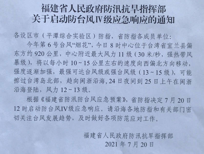 根据《福建省防汛防台风应急预案》,福建省防指决定于7月20日12时启动防台风Ⅳ级应急响应。