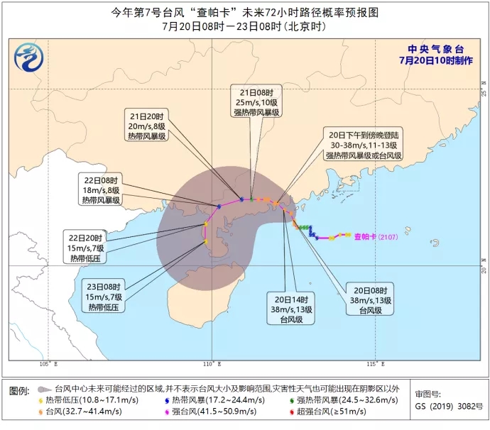 受“查帕卡”影响,7月22日—24日,海南岛北部、西部和东部沿海陆地将出现6~7级、阵风8~9级的大风。20日—24日,南海北部海域风力10~13级;北部湾海面和琼州海峡,风力5~6级、雷雨时阵风7~9级,22日夜间起风力增大到7~8级,阵风9~10级;海南岛西部和东部海面,风力5~6级、雷雨时阵风7~9级,22日夜间起风力增大到7~8级,阵风9~10级。受“查帕卡”外围云系和南海季风云系共同影响,20日—24日,海南岛南部海面,西沙、中沙和南沙群岛附近海面,风力5~6级、雷雨时阵风7~9级。