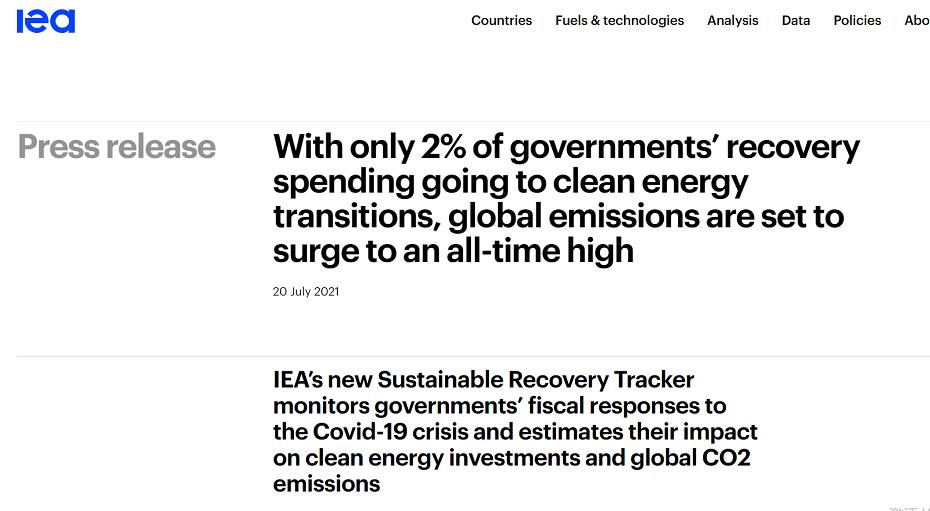 国际能源署认为,世界各国为了应对新冠疫情危机带来的影响,出台了大量经济刺激计划,但是仅有约2%的预算用于清洁能源措施,这对于完成全球气候目标严重不足。同时,发达国家和发展中国家在清洁能源措施上的差距在拉大。