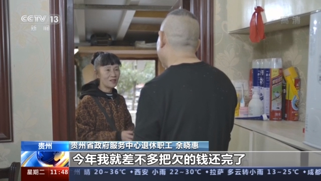 贵州省政府服务中心退休职工 余晓惠:我想就是不管再困难,我也先把别人的钱还了,哪家的钱都不容易。然后我去做了保洁,当钟点工,再捡废品纸壳来卖,虽然真的很累,但再苦再累我都没想过要放弃。努力还是有回报的,今年我就差不多把欠的钱还完了,心里感觉特别踏实。