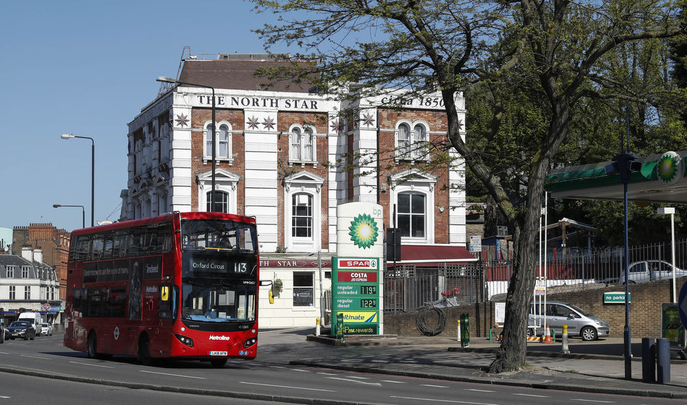 2020年4月21日,一辆红色双层巴士驶过英国伦敦的一家加油站。(新华社记者韩岩摄)
