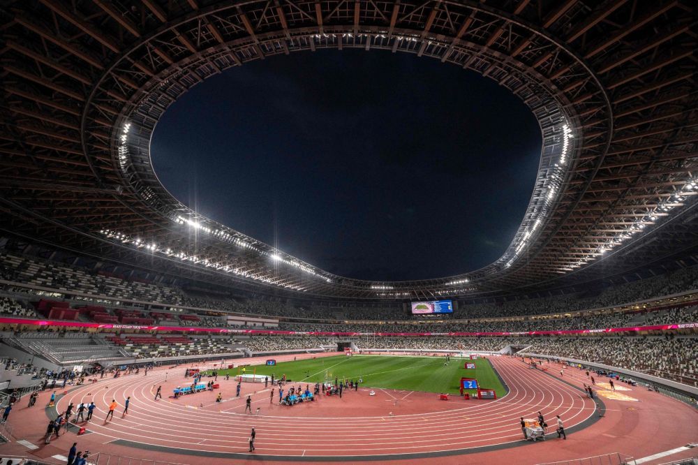 5月9日拍摄的东京奥林匹克体育场内进行的东京奥运会田径测试赛现场。(新华社/法新)