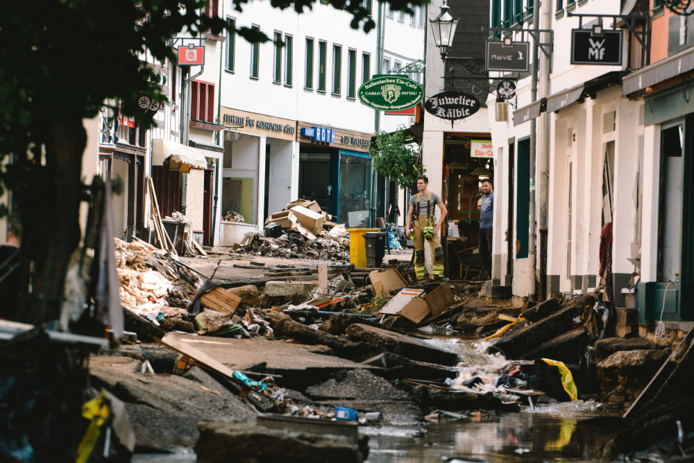 舒尔德镇位于德国西部的莱法州阿尔韦勒县,莱茵河支流阿尔河穿镇而过,河边有成排的住家和店铺。从14日开始,阿尔河水位突涨,越过河堤冲垮了岸边的房屋,大水蔓延至整个小镇,只有地势较高的房屋得以幸免。