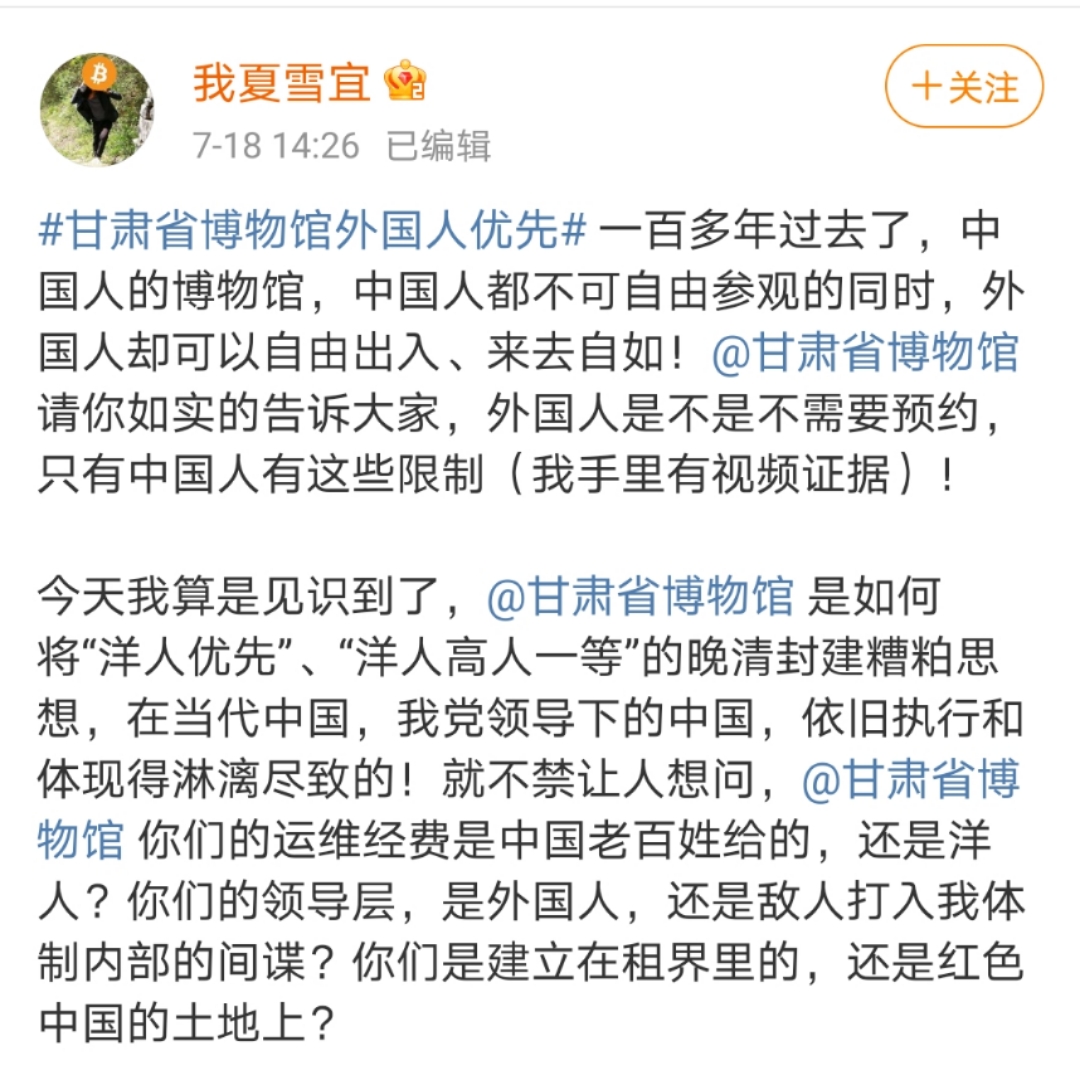 有网友指出,外国游客可不经预约参观甘肃省博物馆。 微博“我夏宜雪” 截图