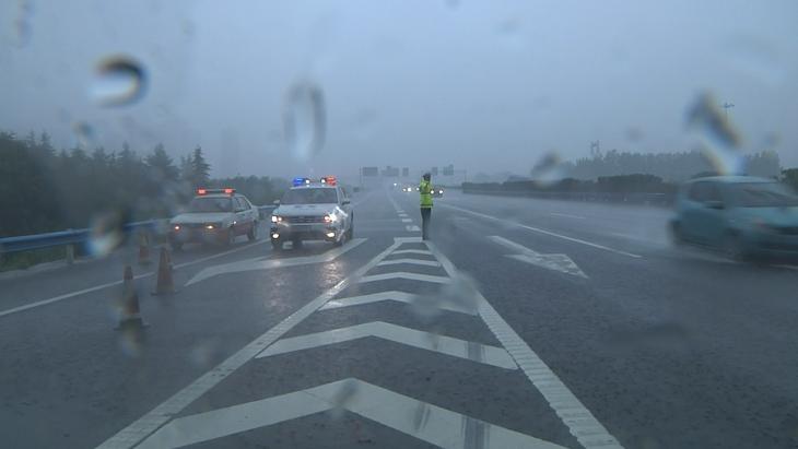 河南高速交警总队民警 杨军政:对“两客一危一货一面”等重点车辆实行降速、限速、控距、亮尾等交通管制保通措施,全力保证群众雨天行车安全。