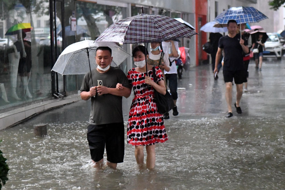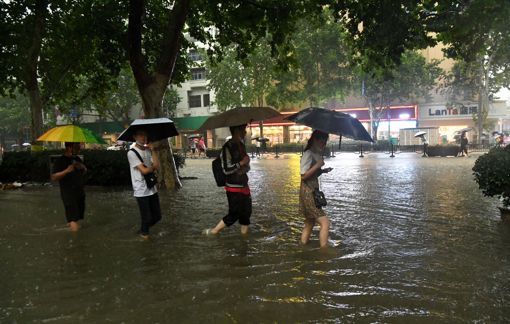 ↑7月20日,郑州市民涉水前行。