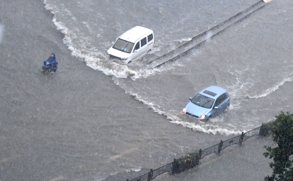 ↑7月20日,车辆在郑州街头涉水前行。