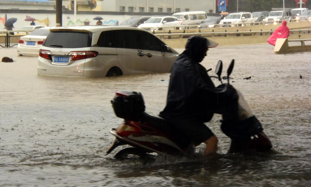 ↑7月20日,郑州市民涉水骑行。