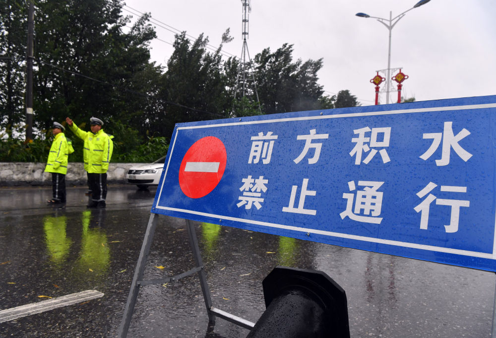 ↑7月20日,在焦作市文昌路新月铁路桥积水处,交警在劝返往来车辆。