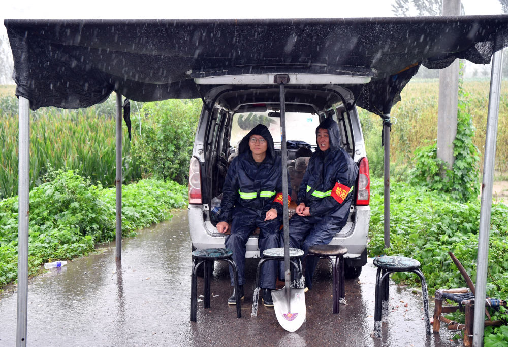 ↑7月20日,在焦作市博爱县磨头镇陈庄村丹河险工段,防汛人员在岗位值守。